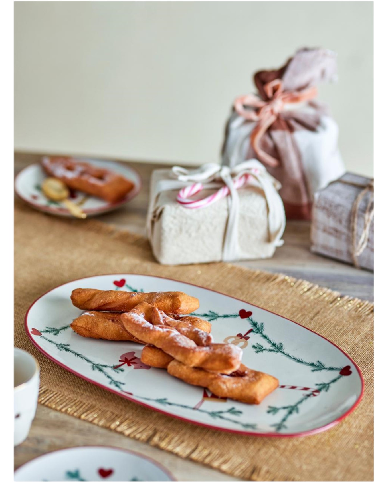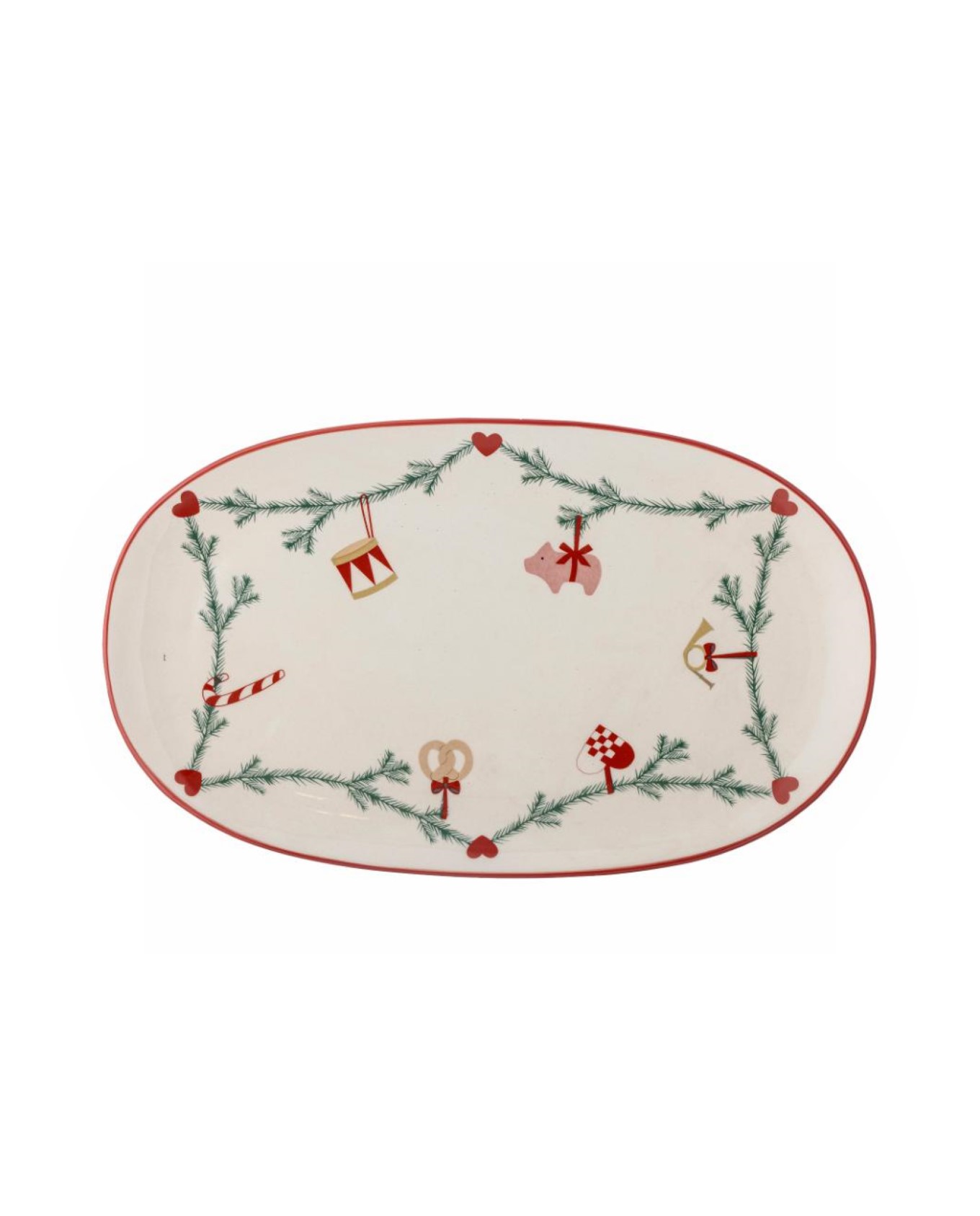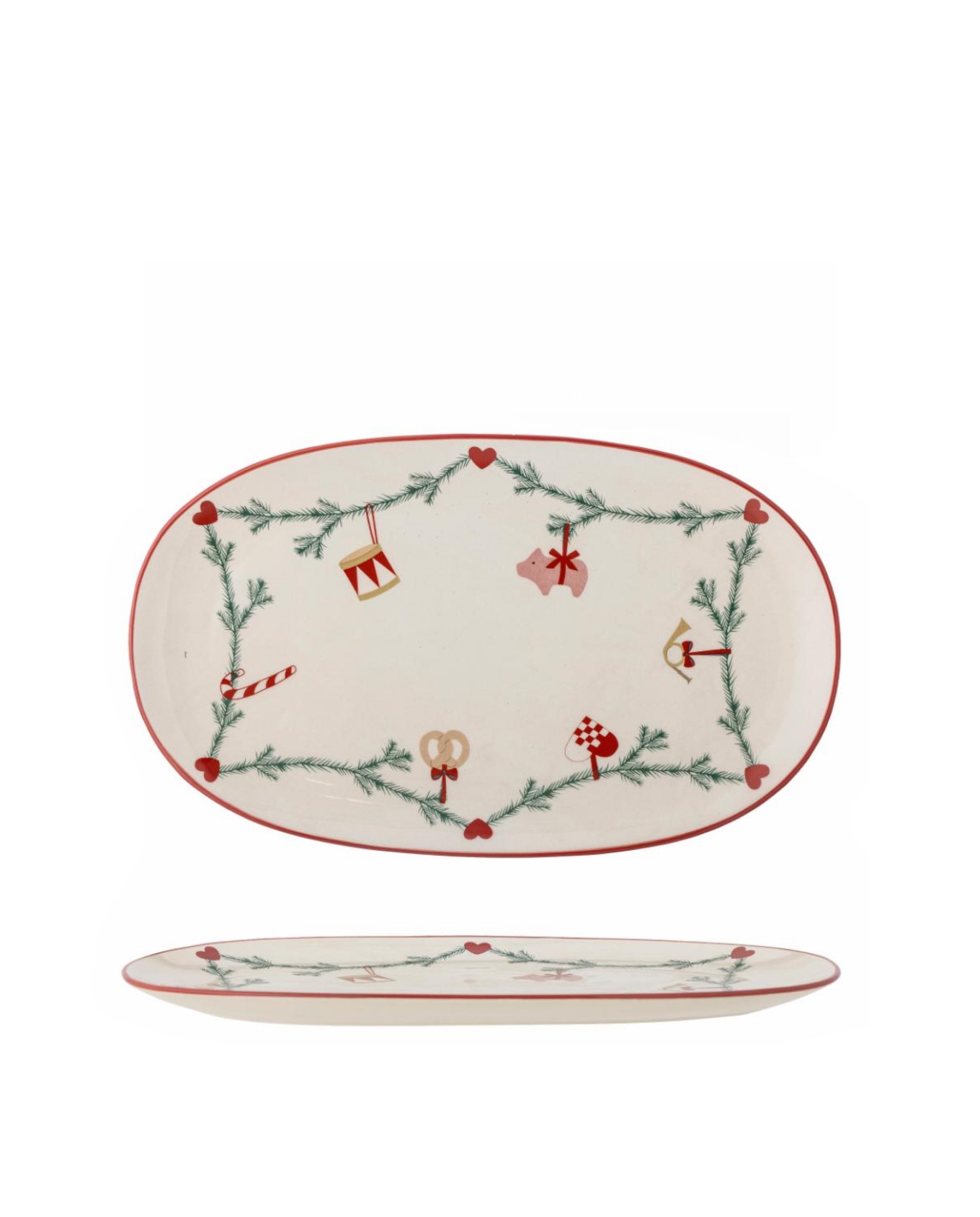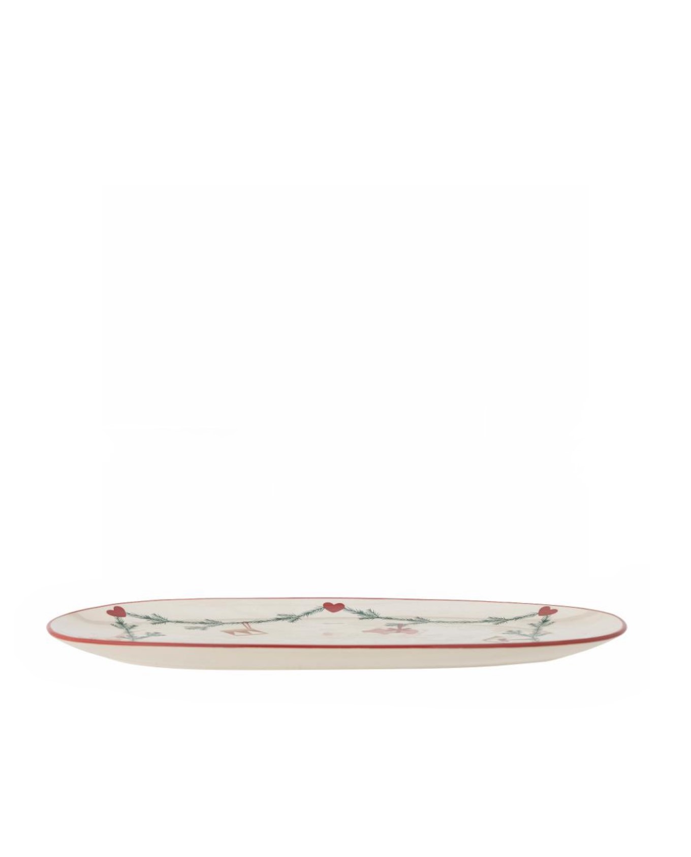 Πιατέλα κεραμική σε οβάλ σχήμα, διακοσμημένο με κλασσικό χριστουγεννιάτικο μοτίβο γιρλάντας ζωγραφισμένη σε μπεζ φόντο, αποτελώντας την τέλεια προσθήκη στο χριστουγεννιάτικο διακοσμημένο σπίτι.