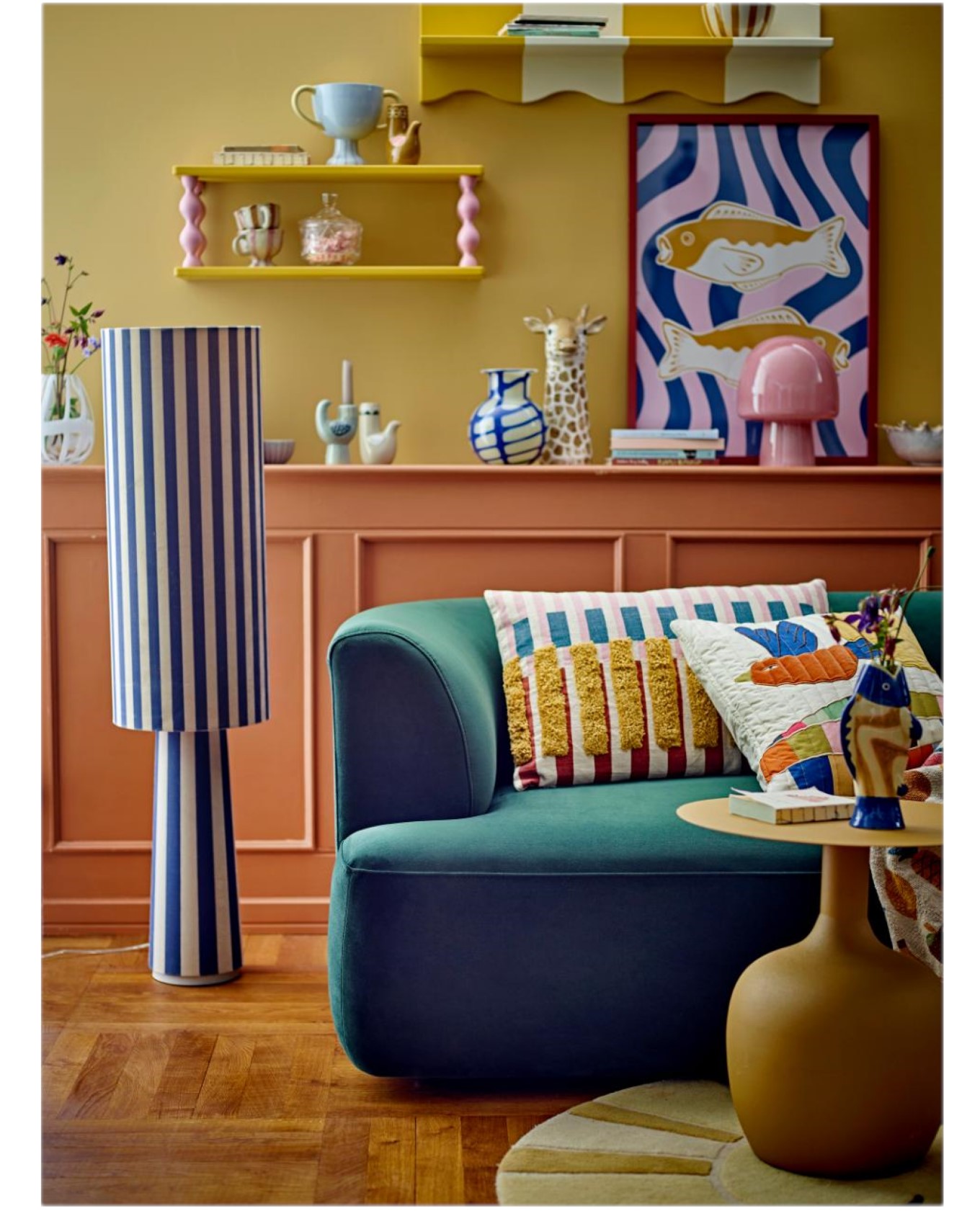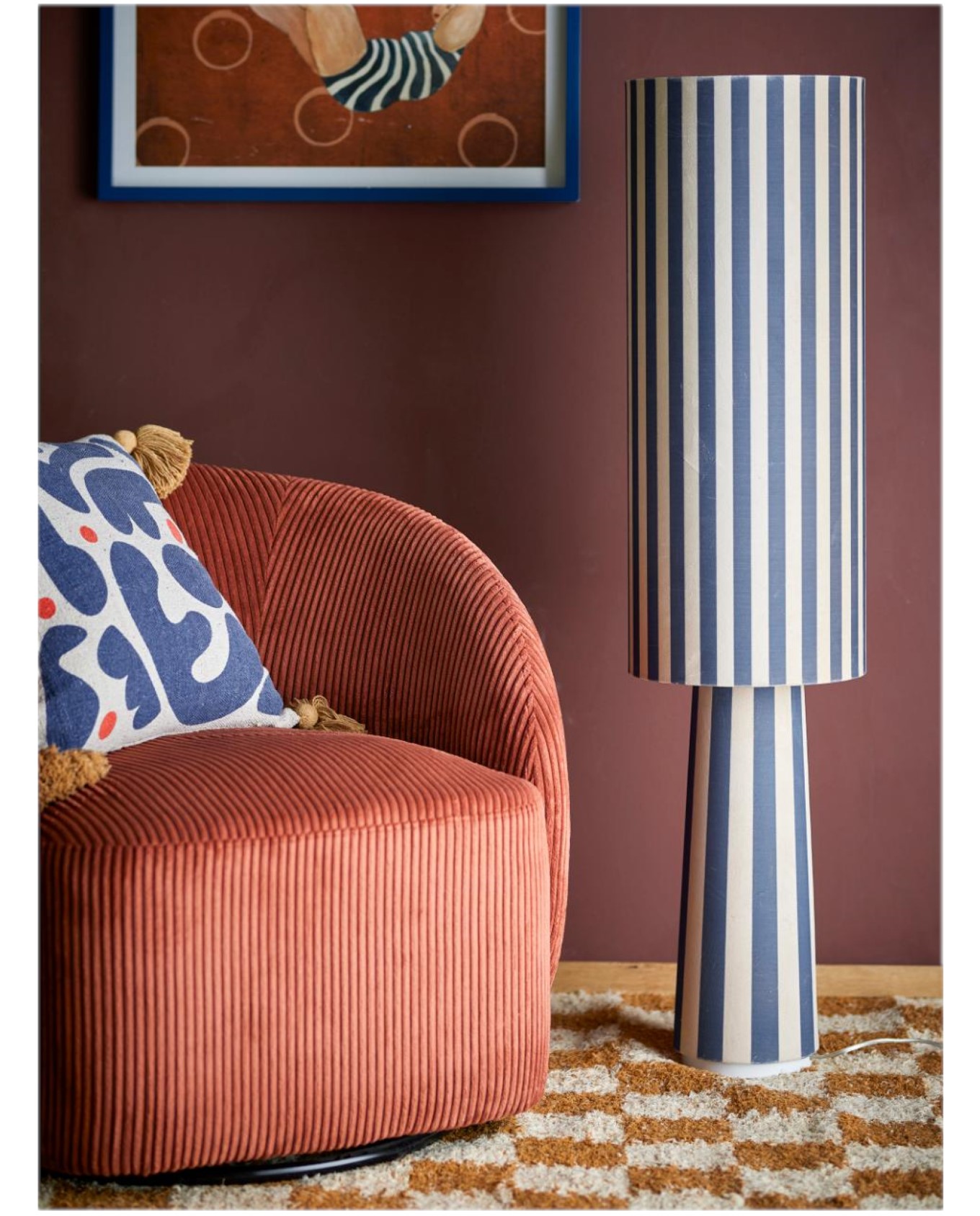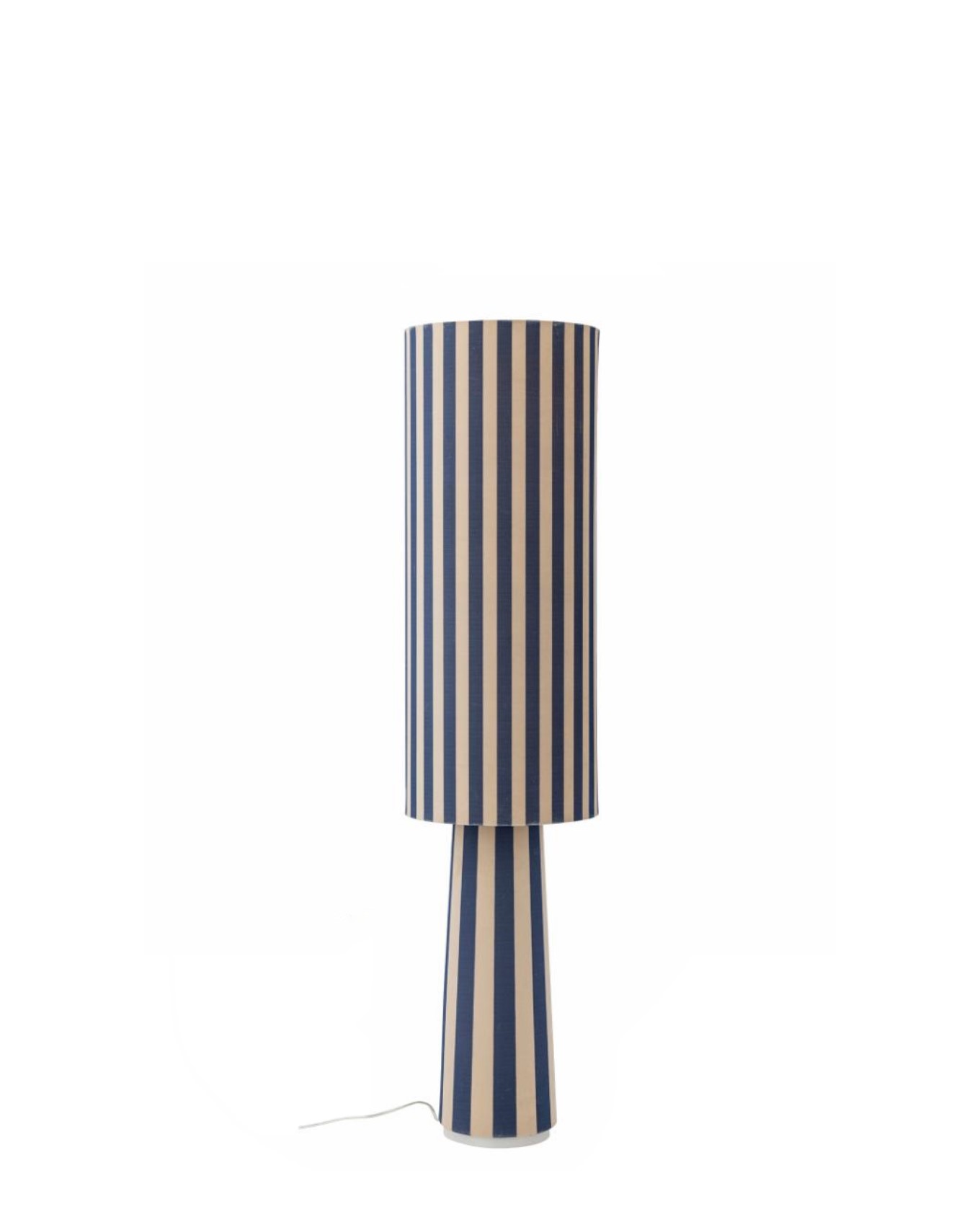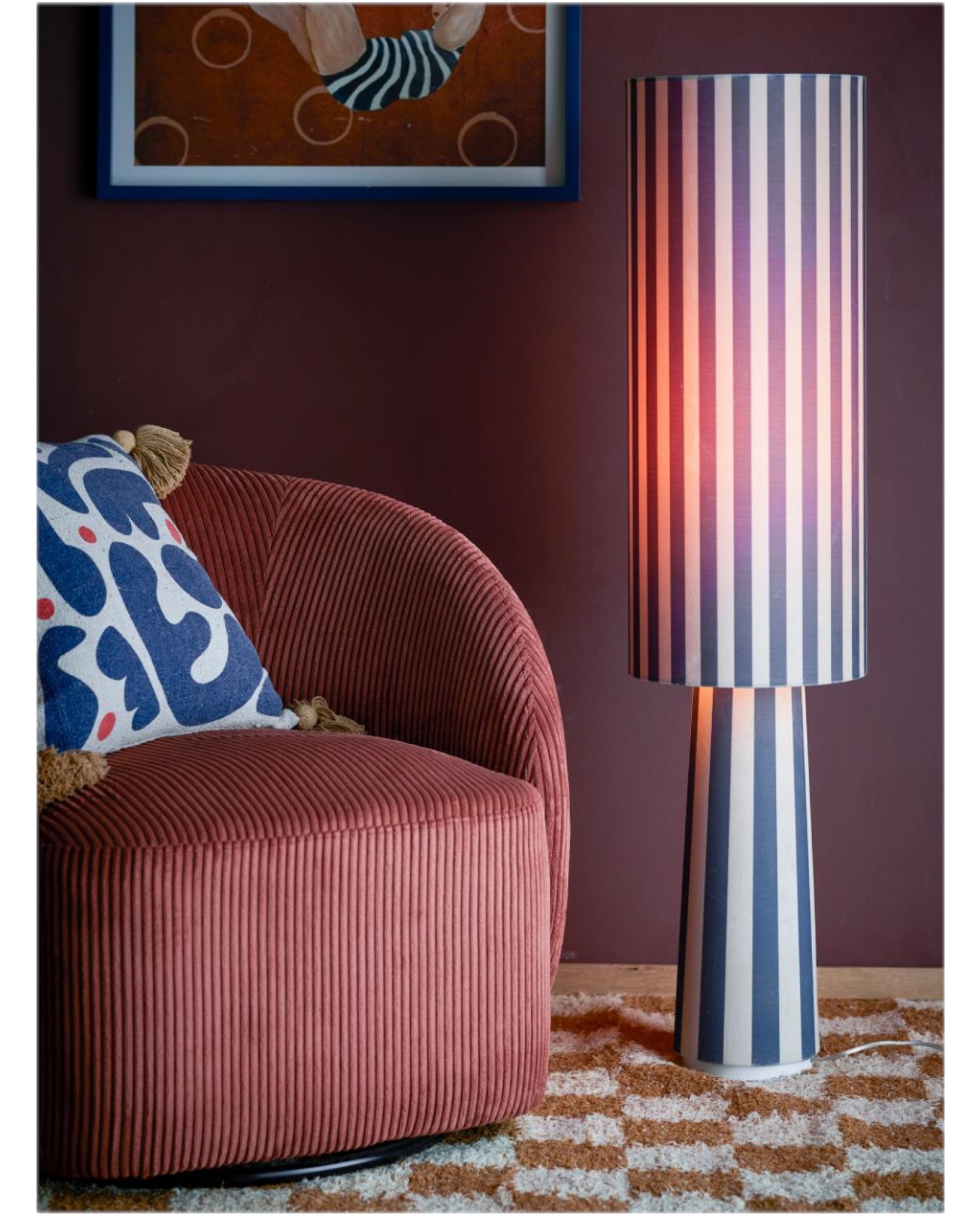 Το φωτιστικό δαπέδου διαθέτει ένα ψηλό, κυλινδρικό καπέλο από απαλό βελούδο με κάθετες ρίγες σε σκούρο μπλε και ανοιχτό μπεζ. Το τυπωμένο σχέδιο και η απλή βάση προσδίδουν στο φωτιστικό μια μοντέρνα και κομψή εμφάνιση που ταιριάζει τόσο σε σαλόνια όσο και σε υπνοδωμάτια.