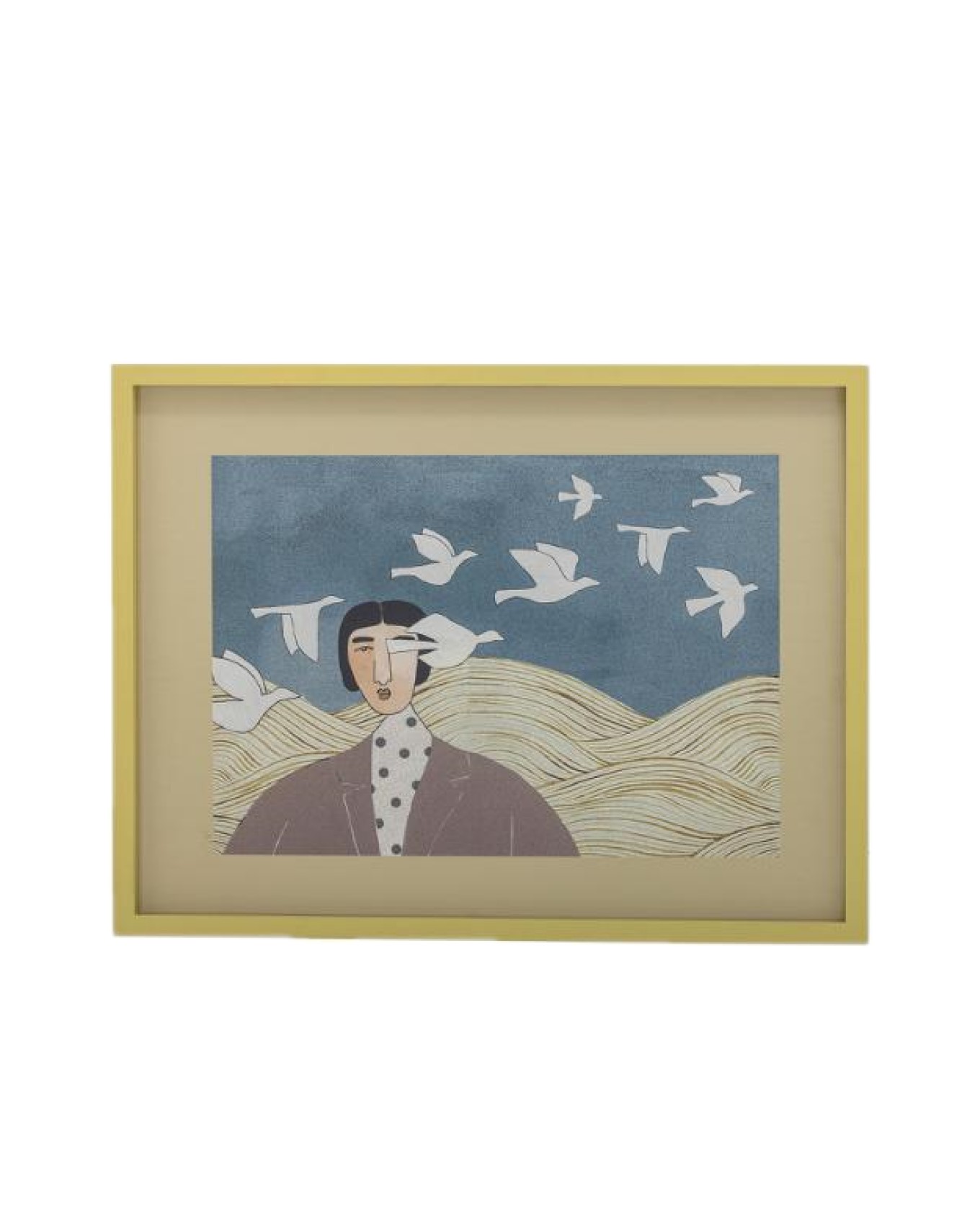 Τα λευκά πουλιά πετούν ελεύθερα στον ουρανό, διασχίζοντας τον χώρο μπροστά και γύρω από τη μορφή. Είναι σαν σκέψεις που περνούν, επιθυμίες που φεύγουν ή ελευθερίες που δεν έχουν ακόμα κατακτηθεί. Ένα από αυτά σχεδόν αγγίζει το πρόσωπο -μια στγμή σύνδεσης ανάμεσα στο όνειρο και την πραγματικότητα.
