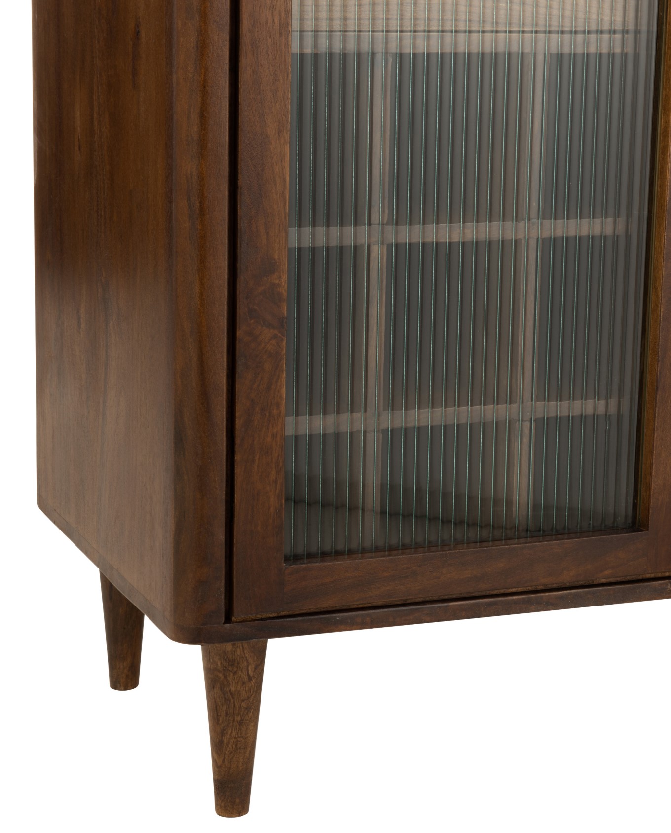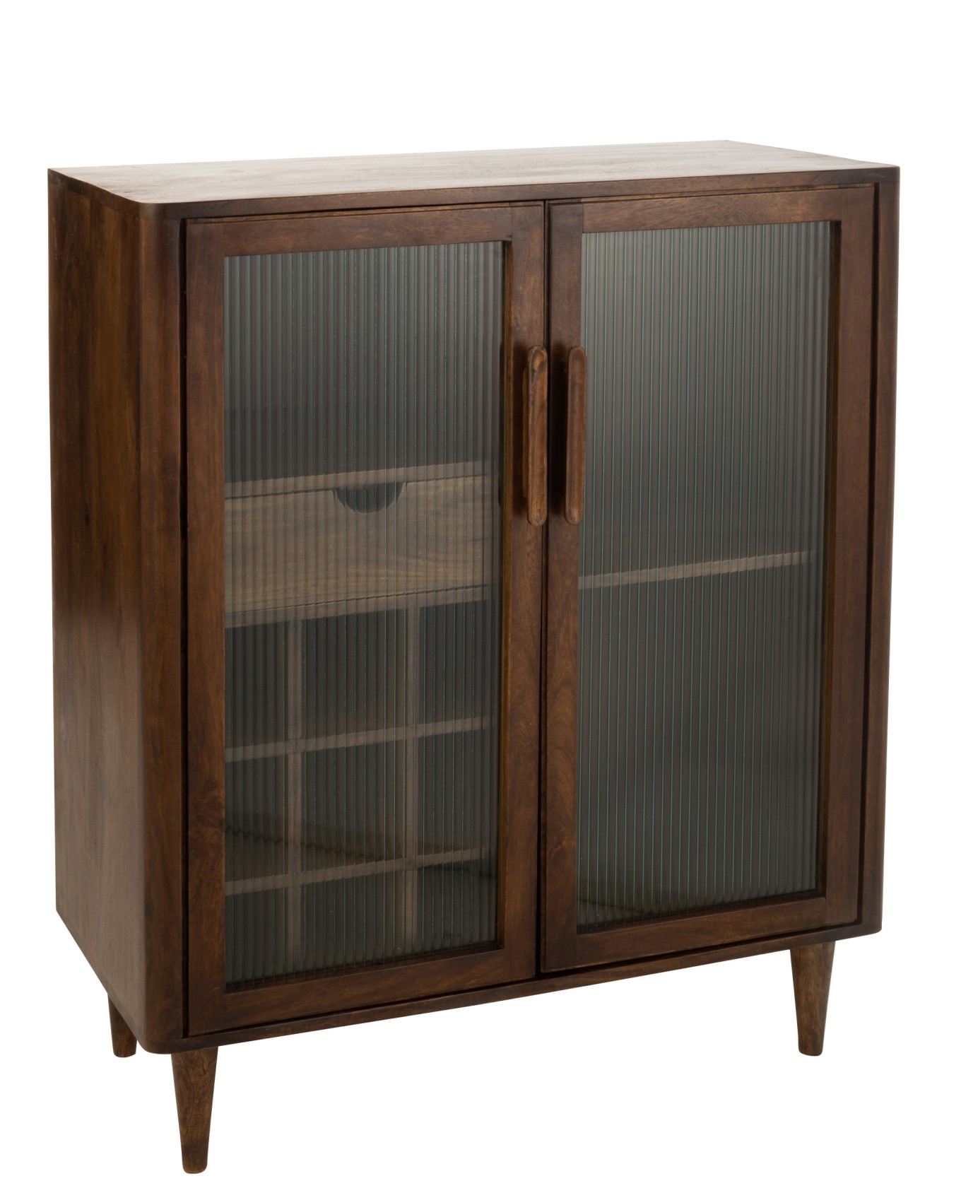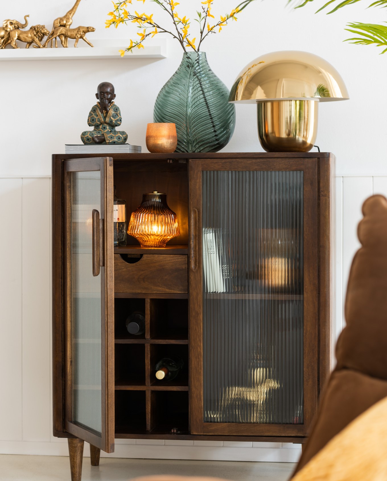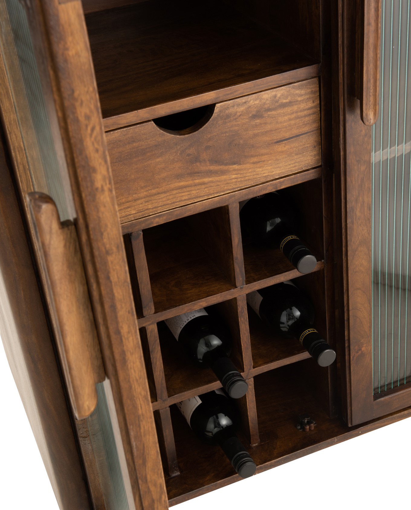 Κάβα ποτών με πόδια. Αποτελείται από 2 ανοιγόμενα φύλλα με ανάγλυφο φιμέ τζάμι σε ρετρό στυλ, ένα εσωτερικό συρτάρι για τα πούρα, θέσεις για 6 μπουκάλια και ράφια. Κατασκευασμένη από ξύλο μάνγκο σε απόχρωση καρυδιάς.