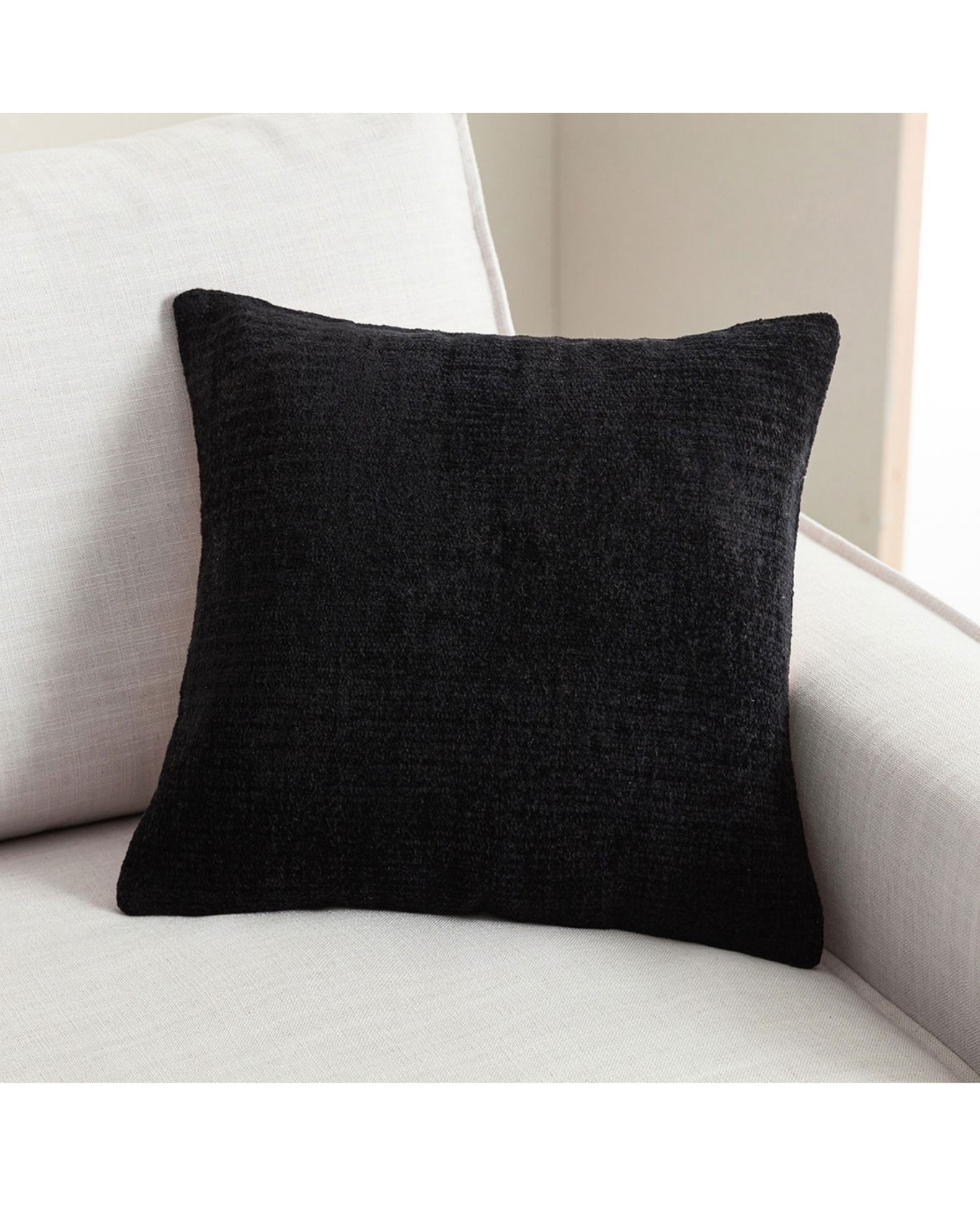 Μαξιλάρι μαύρο με μαλακή πυκνή πλέξη από chenille. Πλένετε στο πλυντήριο στους 30ᴼC, σε χαμηλές στροφές. Περιλαμβάνεται το γέμισμα. chenille είναι νήμα το οποίο κυρίως παράγεται από βαμβάκι, αλλά πολλές φορές μπορεί να κατασκευαστεί και από μια ποικιλία διαφορετικών ινών όπως μετάξι, μαλλί ή ακόμα και rayon, ή πολυεστέρα.