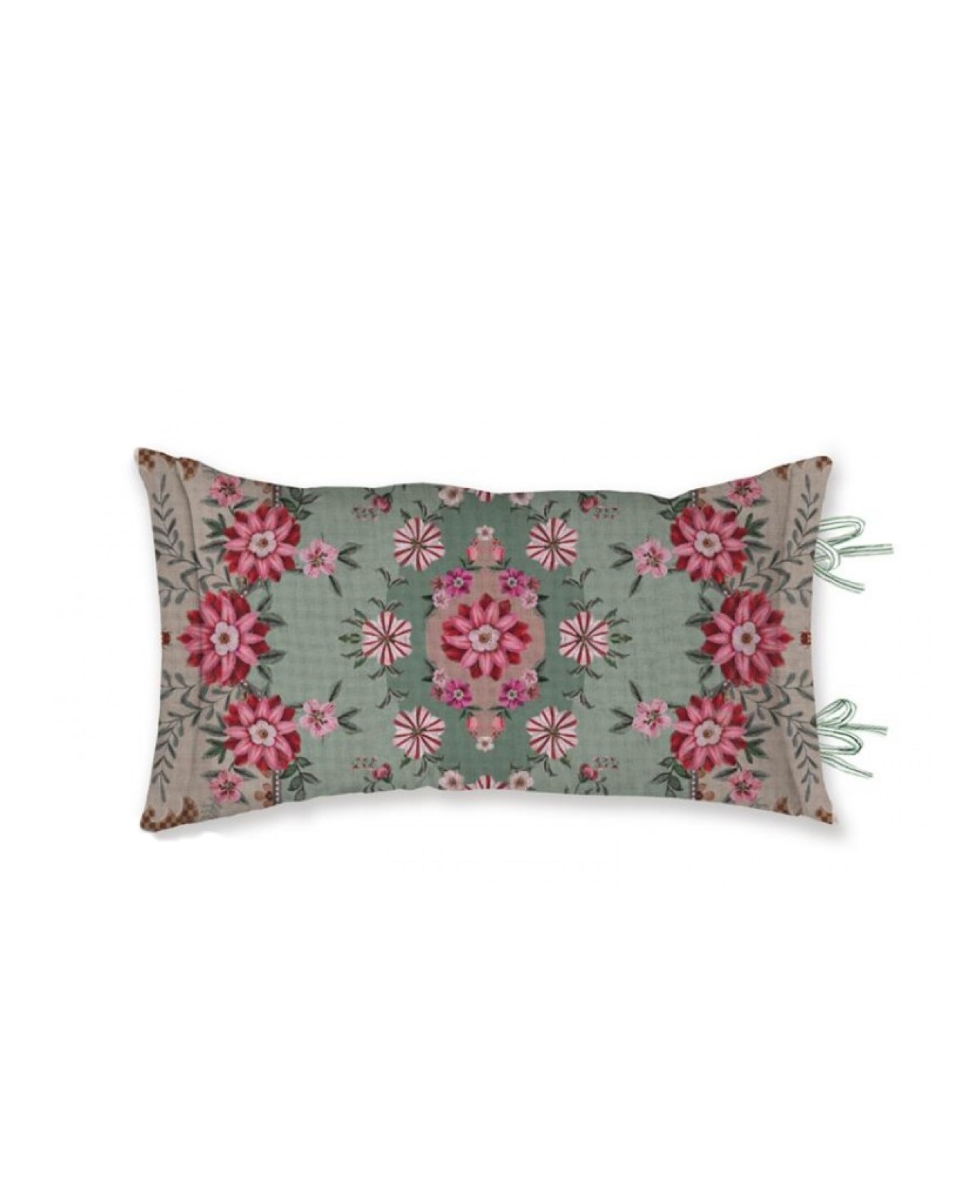 Αυτό το ορθογώνιο, πράσινο διακοσμητικό μαξιλάρι είναι διακοσμημένο με το σχέδιο Pip Chique. Αυτή η εκτύπωση αποτελείται από συμμετρικά τοποθετημένες ροζέτες και φανταστικά λουλούδια. Το μαξιλάρι έχει oxford διακοσμητικό στα πλάγια και ένα μοτίβο από στυλιζαρισμένες καμάρες στο πίσω μέρος. Το διακοσμητικό μαξιλάρι έχει κλείσιμο με κορδόνι και μπορεί να χρησιμοποιηθεί και στις δύο πλευρές.
