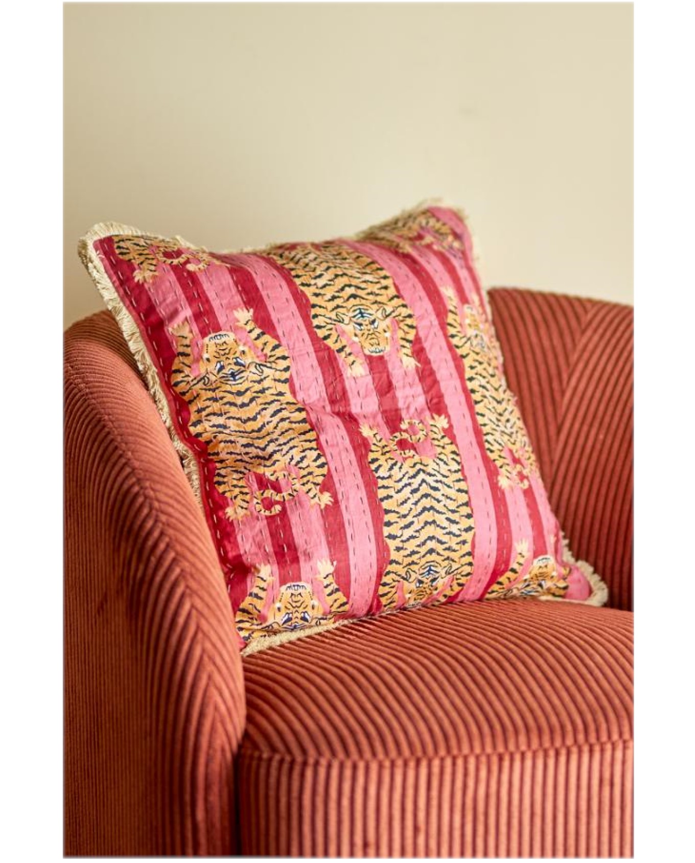 Το μαξιλάρι Poirino της Bloomingville είναι ένα καπιτονέ μαξιλάρι με ζωηρό τύπωμα τίγρης. Διαθέτει χειροποίητες λεπτομέρειες και όμορφα κρόσσια κατά μήκος της άκρης σε ένα χρώμα που κάνει αντίθεση. Τα κρόσσια δημιουργούν ένα εντυπωσιακό πλαίσιο γύρω από το σχέδιο του μαξιλαριού, καθιστώντας το ιδιαίτερα διακοσμητικό. Αυτό το μαξιλάρι είναι η ιδανική επιλογή για όποιον θέλει να προσθέσει περισσότερο χρώμα στη διακόσμησή του.